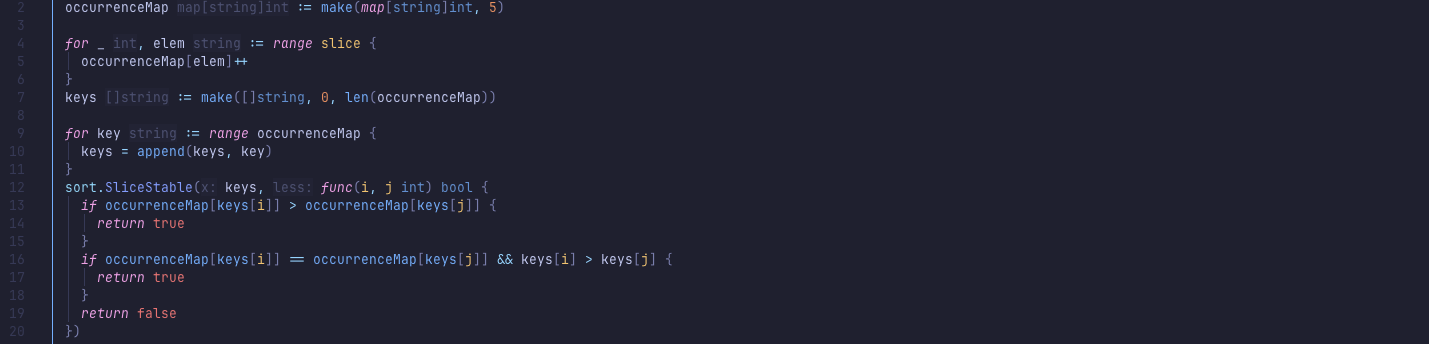 if occurrenceMap[keys[i]] > occurrenceMap[keys[j]] {